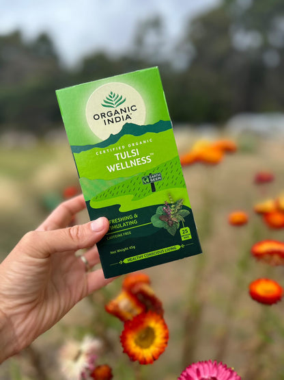 Four giants of Ayurvedic Medicine, "the Queen of Herbs" Tulsi, Brahmi (Gotu Kola), Ashwagandha and Moringa, blend beautifully together to make a powerfully potent infusion to relieve stress, increase stamina, soothe & support the nervous system and vitalise the blood. Delicious, purifying and nourishing, your body will revel in joy. 25 tea bags per pack. Abundant in Antioxidants. Powerful Adaptogen