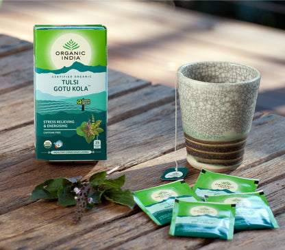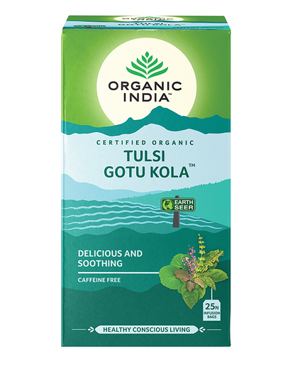Two of India's most nourishing herbs, Tulsi & Gotu Kola, lovings embrace. This healthful and purifying blend balances your nervous system, offers clarity & calm to your mind and enhances overall physical & emotional well-being.